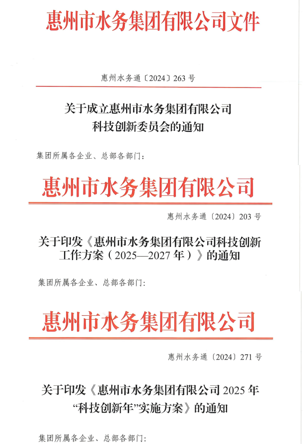 發(fā)布科創(chuàng)工作方案:頒發(fā)《惠州市水務(wù)集團(tuán)有限公司科技創(chuàng)新工作方案(2025—2027年)》,明確未來(lái)三年的科技創(chuàng)新目標(biāo)和實(shí)施路徑。制定《惠州市水務(wù)集團(tuán)有限公司2025年“科技創(chuàng)新年”實(shí)施方案》,有力夯實(shí)集團(tuán)的科技創(chuàng)新基礎(chǔ)。