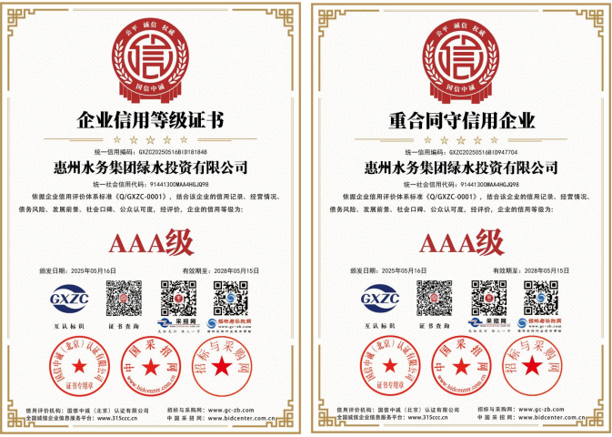 惠州水務(wù)集團(tuán)綠水公司榮獲多項(xiàng)權(quán)威認(rèn)證及榮譽(yù)證書