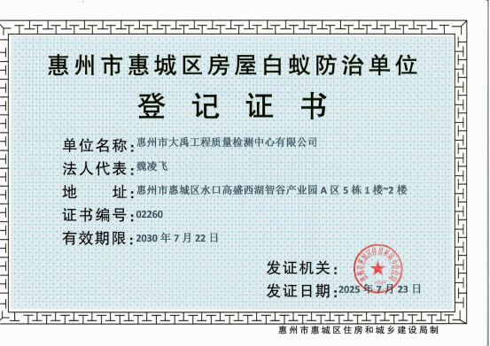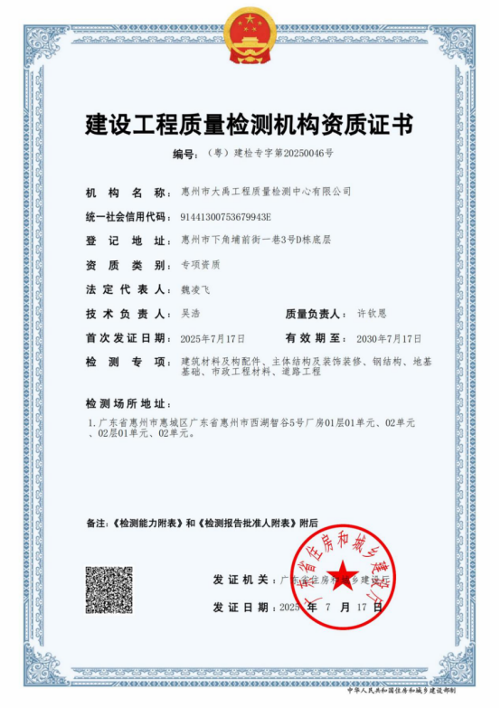 近日,惠州水務(wù)集團(tuán)大禹檢測公司順利拿下廣東省住房和城鄉(xiāng)建設(shè)廳頒發(fā)的建設(shè)工程質(zhì)量檢測機(jī)構(gòu)資質(zhì)證書(編號(hào):(粵)建檢專字第20250046號(hào)),資質(zhì)范圍覆蓋建筑材料及構(gòu)配件、主體結(jié)構(gòu)及裝飾裝修、鋼結(jié)構(gòu)、地基基礎(chǔ)、市政工程材料、道路工程等六大專項(xiàng),突顯大禹檢測公司在建設(shè)工程質(zhì)量檢測領(lǐng)域的整體實(shí)力邁上新高度;同步獲惠州市惠城區(qū)住房和城鄉(xiāng)建設(shè)局頒發(fā)的房屋白蟻防治單位登記證書(編號(hào):02260)。至此,公司成為惠州少數(shù)具備“檢測+防治”一體化服務(wù)能力的機(jī)構(gòu)。