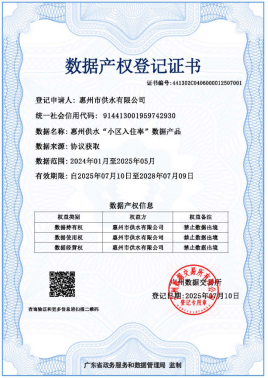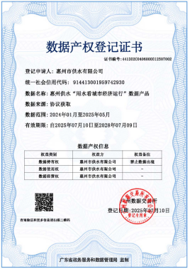 惠州水務(wù)集團(tuán)供水公司再添兩張數(shù)據(jù)產(chǎn)權(quán)登記證書,數(shù)字化轉(zhuǎn)型成果豐碩